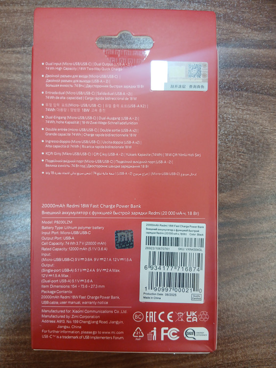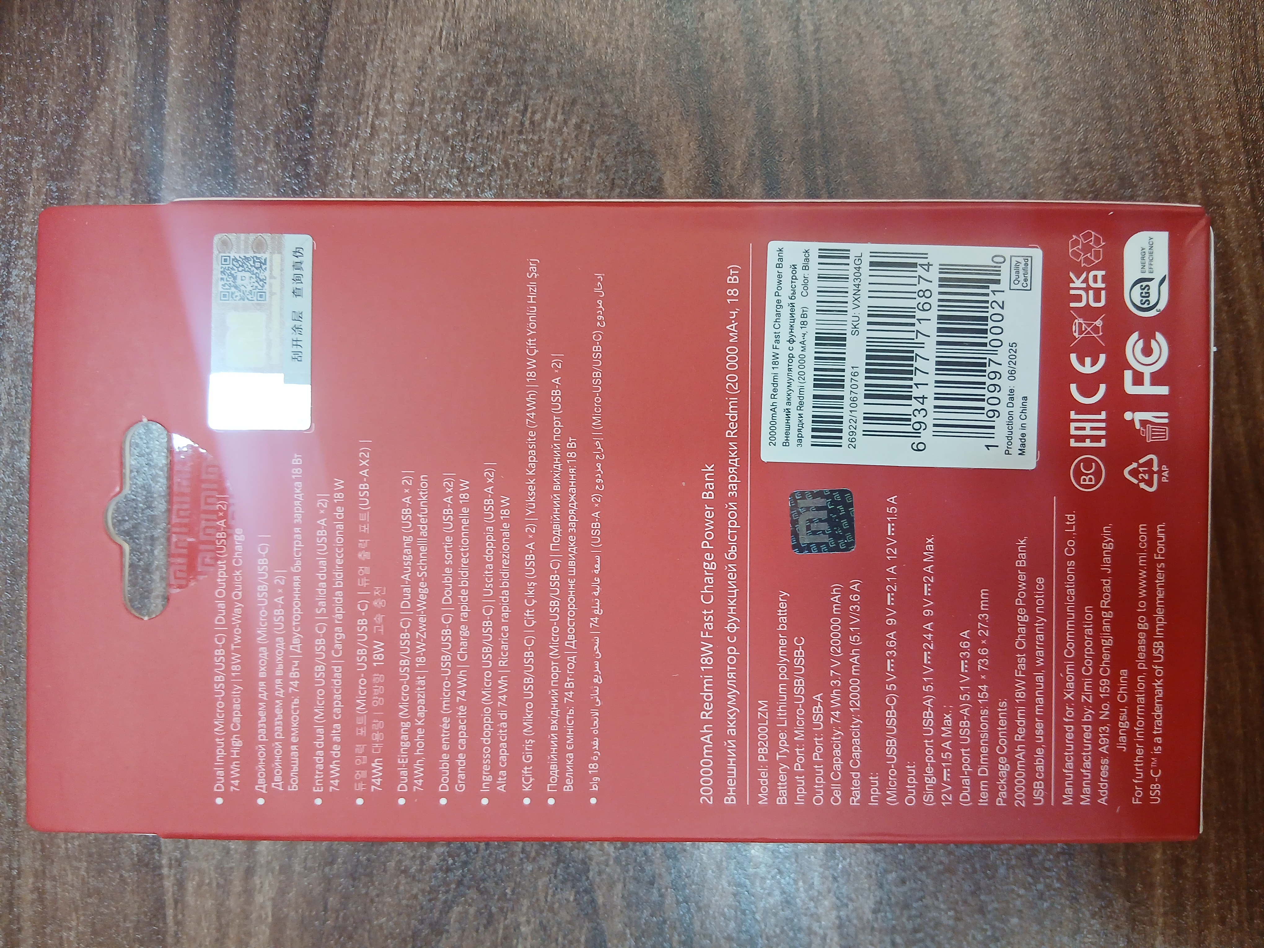 پاور بانک 20000 شیائومی فست شارژ اورجینال مدل Redmi با ظرفیت 20000 میلی آمپر ساعت به همراه کابل اورجینال